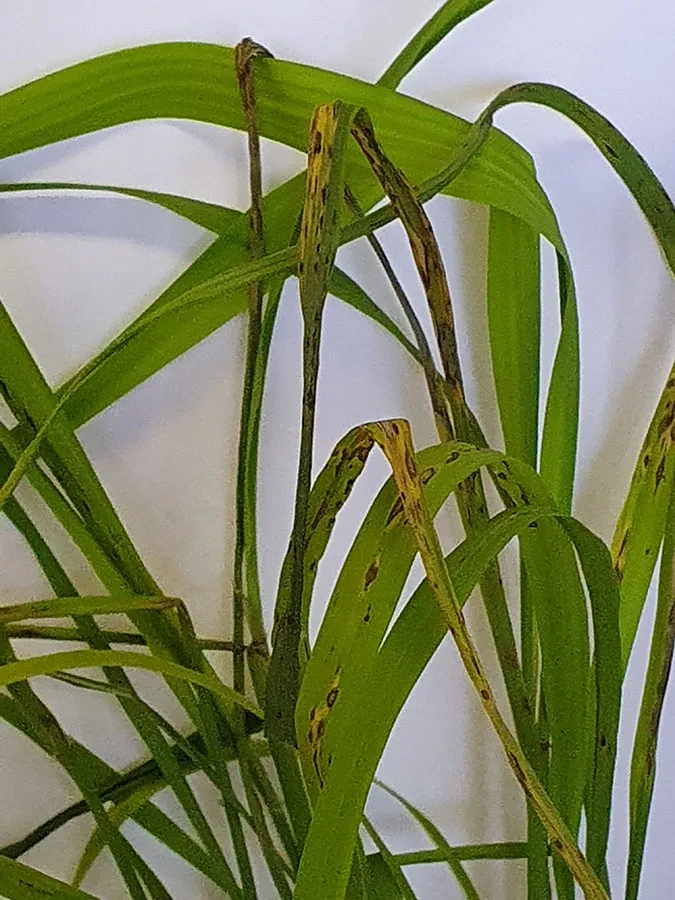 Os sintomas nas folhas iniciam-se com a formação de pequenas lesões necróticas de coloração marrom, que aumentam em tamanho e se tornam elípticas, de margens marrons e centro cinza ou esbranquiçado. Em condições favoráveis, as lesões causam a morte das folhas e, muitas vezes, da planta inteira.