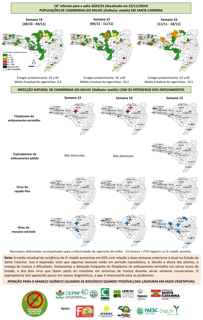 O boletim da 16ª semana de monitoramento destaca ainda a detecção do fitoplasma do enfezamento-vermelho em vários locais do Estado. Os vírus rayado-fino e do mosaico estriado também têm sido encontrados por várias semanas consecutivas.