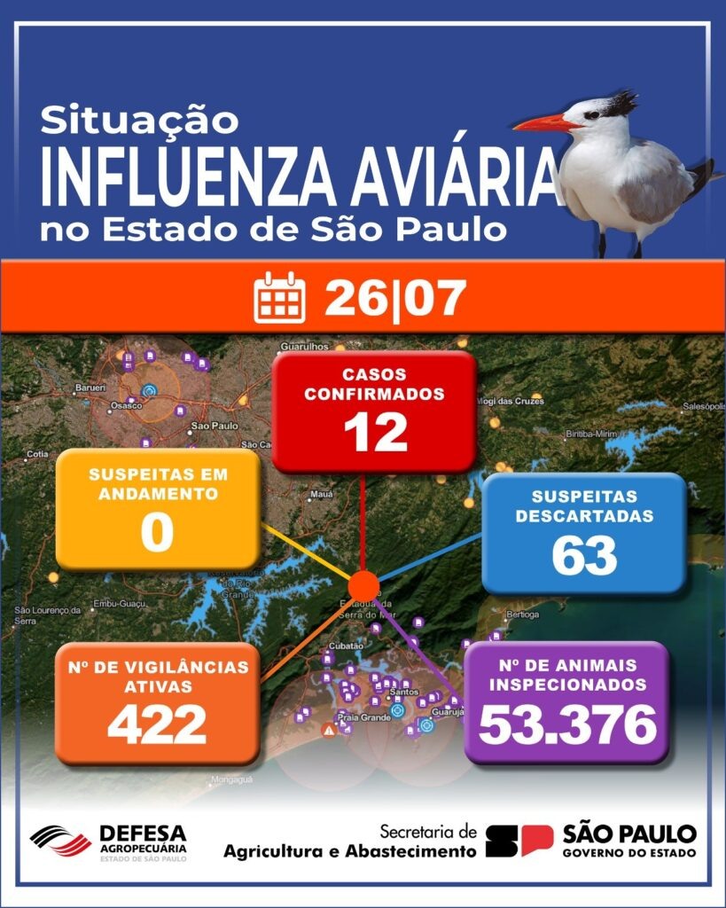A Coordenadoria de Defesa Agropecuária (CDA) da Secretaria de Agricultura e Abastecimento (SAA) anunciou hoje a confirmação do 12º caso positivo de influenza aviária em aves silvestres no estado de São Paulo.