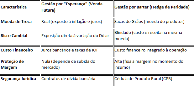 Diante de uma Selic em patamares elevados e do crédito bancário escasso, o Barter deixa de ser apenas uma “forma de pagamento” para se tornar um mecanismo de Hedge Natural. Ao fixar a quantidade de sacas necessárias para liquidar o pacote tecnológico, o produtor trava seu custo em sua própria “moeda” (o grão), eliminando o risco de descasamento cambial e a volatilidade da commodity.