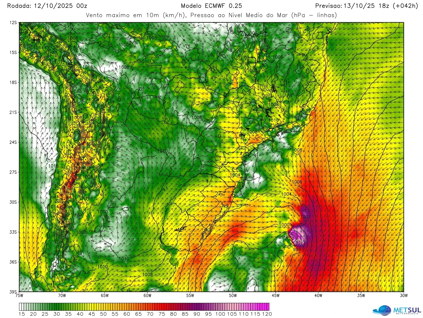 Mais uma vez reiteramos que este ciclone não será intenso. Os dados analisados dos modelos meteorológicos indicam o centro de baixa pressão com 997 hPa a 998 hPa na foz do Rio da Prata nesta segunda-feira (13).