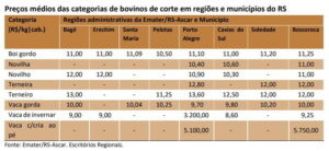 De acordo com o levantamento semanal de preços realizado pela Emater/RS-Ascar, o valor médio do boi para abate no Estado aumentou 1,55%, de R$ 10,95 para R$ 11,12/kg vivo, e o da vaca para abate aumentou 0,50%, de R$ 9,98 para R$ 10,03/kg vivo.